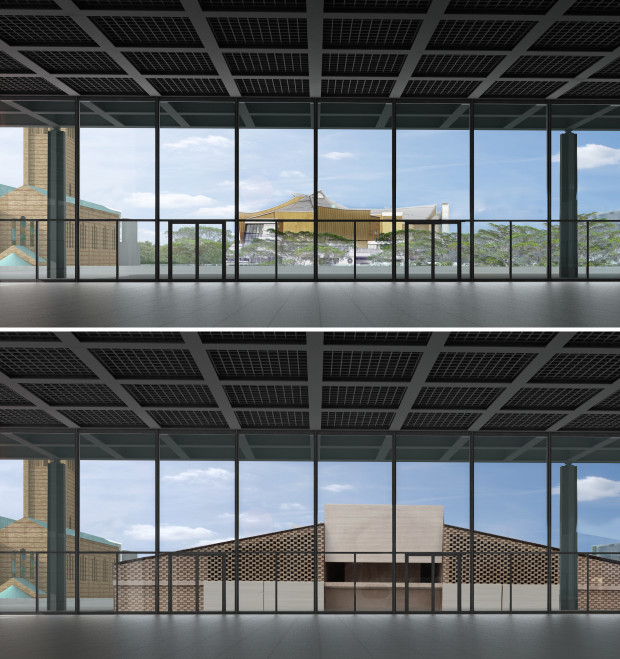 Alles richtig, sehr geehrter Herr Herles, und schon allein die Nachbarschaft einer solchen Scheune zur zierlichen Kirche von Stüler, ist ein Wahnsinn. Die Zerstörung der Sichtachse und die Verschandelung der Aussicht aus der Nationalgalerie, ist ja oben dankenswertersweise sehr realistisch dargestellt. Natürlich wäre da ein Platz wunderbar, ein gepflegter Platz, wie er in Berlin leider so gut wie überhaupt nicht vorkommt. Alle Beteilgten errichten sich hier ein irrsinnig teures Denkmal der vollkommenen Geschmacklosigkeit, man sollte später ihre Namen Tag und Nacht mit Leuchtschrift über ihre Bierzeltfassade laufen lassen.