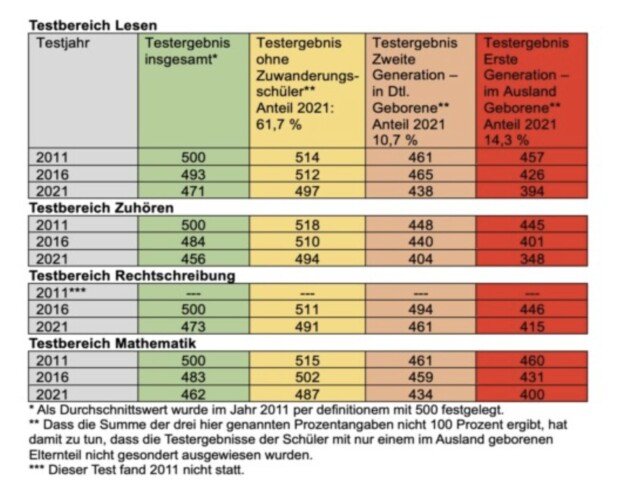 Wo stehen „Schüler mit Zuwanderungsgeschichte“? Das „Institut zur Qualitätsentwicklung im Bildungswesen“ (IQB) der Humboldt-Universität zu Berlin belegte 2022, dass die Leistungen dieser Schüler seit 2015 immer noch schwächer geworden sind. Getestet waren mit streng objektiven, standardisierten Test Viertklässler, die nächste Testung erfolgt 2026.