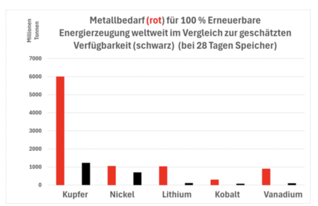 Die für die Installation von Solar- und Windkraftanlagen, Kabeltrassen, Speichern (Batterien und Wasserstoff), E-Fahrzeugen, Wärmepumpen notwendigen spezifischen Metalle wie Kupfer, Nickel, Lithium, Cobalt, Vanadium und Graphit werden nach Michaux in den nächsten 20 Jahren nicht ausreichend zur Verfügung stehen. Es ist ja bekannt, dass der Ersatz von Kohle, Erdöl und Gas erst mit einem erheblichen Aufwand an Metallen möglich wird: Eine 6-MW Windkraftanlage besteht aus 30-50 Tonnen Kupfer und bis zu 300 Kilogramm Seltenen Erden. Ein E-Fahrzeug benötigt 10 Kilogramm Kobalt, 10 Kilogramm Nickel und 60-80 Kilogramm Kupfer, 4-5 mal soviel Kupfer wie ein Diesel oder Benziner.