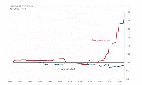 Reiche kritisiert dagegen zu Recht die überbordende Bürokratie in der Energiepolitik. Über 15.000 Rechtsnormen führen die Teilnehmer am Energiemarkt zu administrativer Überforderung. Der vor kurzem erschienene Bericht von Frontier economics „Neue Wege in der Energiewende“ quantifiziert: „die energiewende-getriebene Bürokratie verursacht allein auf Bundesebene geschätzt jährlich rund 10 Mrd. € an Bürokratiekosten„. Die nächste Grafik zeigt diesen rasanten Anstieg der Bürokratiekosten seit 2017.