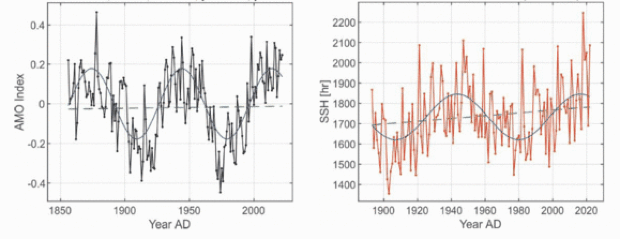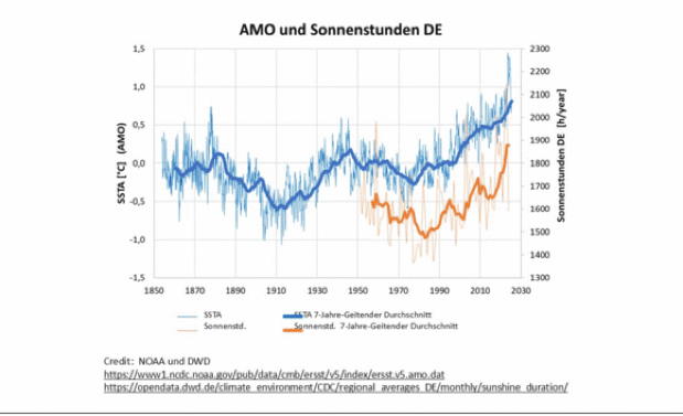 Dass eine Erwärmung der Ozeane die Wolken verändern kann, ist allerdings möglich. Das gilt für den begrenzten Treibhauseffekt des CO2 (s.o.), aber das gilt auch für die natürliche Erwärmung und Abkühlung der Ozeane. Seit hunderten von Jahren schwingen die Ozeane in einem Zyklus von Warm- und Kaltphasen von etwa 60-70 Jahren (AMO – atlantische multidekadische Oszillation). Und nun wird es spannend: Die Wolken tanzen im gleichen Takt. Bei hohen Meerestemperaturen sind die Wolken durchlässig, bei niedrigen Temperaturen lassen sie weniger Sonnenlicht auf die Erde. Sie verlaufen exakt gegenläufig. Im nächsten Diagramm sehen wir den Verlauf von Sonnenscheindauer und AMO.