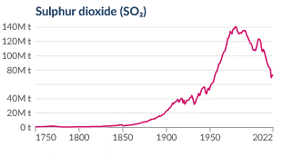 Aber warum haben sich die Wolken in den letzten 20 Jahren verdünnt? Hauptkandidat für diese Entwicklung sind die Umweltschutzmaßnahmen weltweit zur Abscheidung von Staub und Schwefeldioxid (SO2) – zunächst in den USA und Europa ab 1980 und dann verstärkt auch in China und Südostasien ab 2005. Die Schwefeldioxid- Emissionen gingen von 2005 bis 2022 um fast die Hälfte zurück. Hinzu trat ab 2020 die Reduzierung der Schiffahrtsemissionen. Sie entfernten allein 7 Millionen Tonnen Schwefeldioxid aus der Luft über den Weltmeeren.
