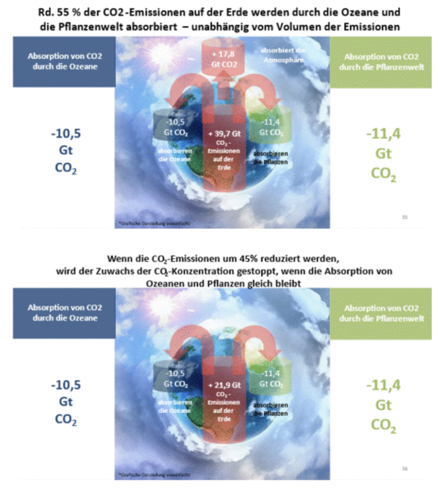 Schon heute werden 29 Prozent der Emission von den Pflanzen aufgenommen und 26 Prozent durch die Ozeane, zusammen also 55 Prozent aller CO2 Emissionen weltweit.