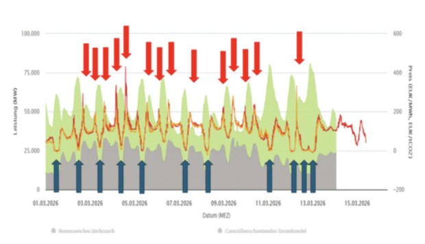 Abbildung: Stromerzeugung und Strompreis im März 2026. Die linke y-Achse gilt für die Leistung: Erneuerbar (grün), Kohle und Gas (grau). Die rechte y-Achse gilt für die rote Strompreiskurve. Rote Pfeile: hohe Strompreise, blaue Pfeile: Strompreis nahe Null