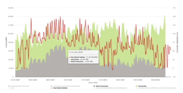 Zwar fließen in den Transformationsfonds die CO2-Abgaben der Bürger für die Gas- und Strom-Heizung, sowie für Benzin und Diesel, die CO2-Abgabe der Industrie und die angehobene Dieselsteuer der Bauern, aber das wird nicht reichen, den wertlosen Überschussstrom aus Windanlagen und Solaranlagen mit 18,6 Milliarden Euro zu bezahlen. Aufgrund des weiteren Zubaus wird dieser Betrag Jahr für Jahr weiter steigen, solange das Erneuerbaren-Energien-Gesetz mit dem auf 20 Jahre garantierten Festpreis für die Einspeisung nicht geändert wird. Denn wie der folgenden Grafik zu entnehmen ist, geht das auch im Januar 2024 munter weiter. Wenn zu viel Wind- und Solarstrom (grün) im System ist, geht der Preis (rot) gen Null und die Rechnung wird an den Finanzminister weitergereicht (Grafik Fraunhofer energy charts, rot Börsenstrompreis, grün Erneuerbarer Strom, grau Kohle und Gasstrom).