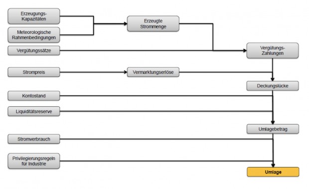 Bisher sind über 400.000.000.000 Euro für ein überwiegend erratisches Stromaufkommen aus regenerativen Energiequellen bewegt worden, um schwankend zwischen etwa fünf und fast hundert Prozent des Bedarfs zu decken. Nutznießer sind nicht nur deutsche Ökoinvestoren, auch die chinesische Solarindustrie ist im Wesentlichen durch deutsches Geld entstanden. Die Umlage für die Bürger stieg von 0,19 im Jahr 2000 auf heute 6,88 Cent pro Kilowattstunde – plus Mehrwertsteuer. Hier das Berechnungsprinzip (Quelle: Fraunhofer ISE):