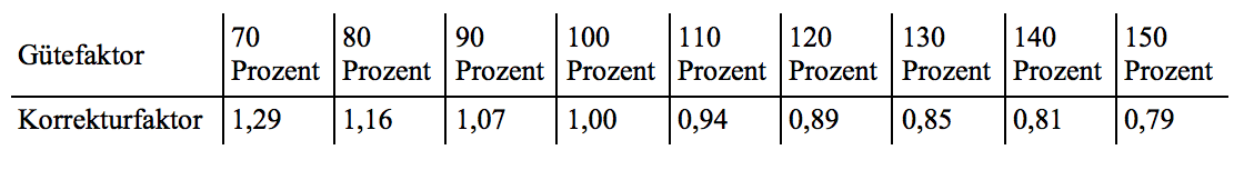 Für die Ermittlung der Korrekturfaktoren zwischen den jeweils benachbarten Stützwerten findet eine lineare Interpolation statt. Der Korrekturfaktor beträgt unterhalb des Gütefaktors von 70 Prozent 1,29 und oberhalb des Gütefaktors von 150 Prozent 0,79. Gütefaktor ist das Verhältnis des Standortertrags einer Anlage nach Anlage 2 Nummer 7 zum Referenzertrag nach Anlage 2 Nummer 2 in Prozent.