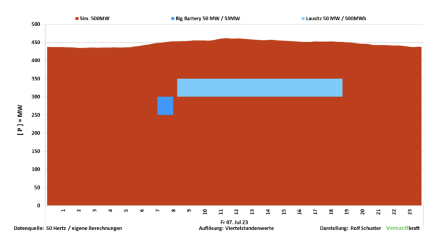 Im folgenden Bild die Tagesproduktion eines einzigen 500-Megawatt-Braunkohle-Kraftwerksblockes in der Lausitz (am 7. Juli 2023). Die Kapazitäten der größten hier vorhandenen Batterie (BigBattery am Kraftwerk Schwarze Pumpe, 50 MW / 53 MWh) und der nächsten geplanten Batterie (Lausitz Battery am Kraftwerk Boxberg, 50 MW / 500 MWh) sind als Flächen eingezeichnet.