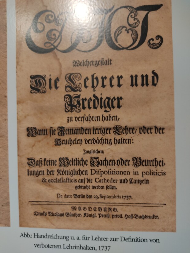 Gesehen im Heimatmuseum Wolmirstedt: Handreichung u.a. für Lehrer zur Definition von verbotenen Lehrinhalten, 1737