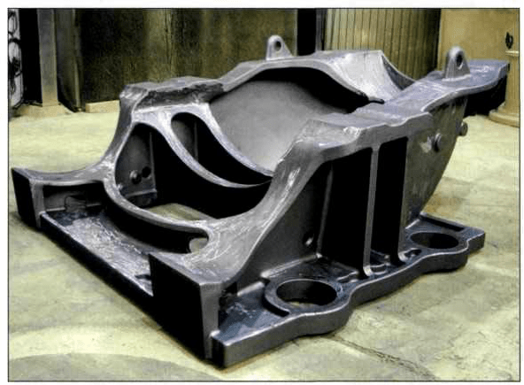 Ebenfalls aus Stahlguss bestehen die Verbindungsstücke zwischen Nabe und Turm (Grundrahmen einer 2-MW-Anlage, 8,65 t):