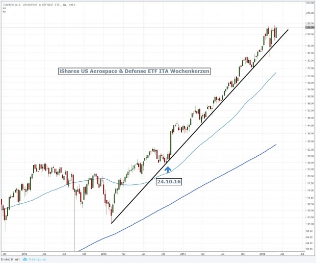 Hier finden Sie das Chart des US Sektor-ETFs ITA, der alle großen amerikanischen Unternehmen von Boeing (BA) bis Lockheed Martin (LMT) beinhaltet. Ich „fieser Kerl“ habe mir erlaubt den 24.10.16 zu markieren, als ich Ihnen hier auf TE den am Anfang genannten Artikel geschrieben habe, die Differenz ist ein Anstieg von 60% in 1,5 Jahren, nicht schlecht Herr Specht: