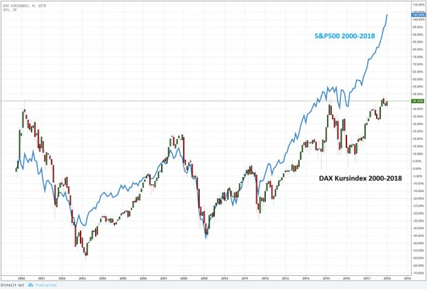 Aber wie auch immer, der Punkt ist, ein fairer Vergleich des DAX mit den meisten anderen Indizes müsste mit dem Kursindex erfolgen, denn auch S&P500 und Co. schütten ja Dividenden aus und das kräftig. Dann machen wir das mal, ich habe hier den fairen Vergleich des DAX-Kursindex gegen den S&P500, beide in Landeswährung und beide ohne Dividenden: