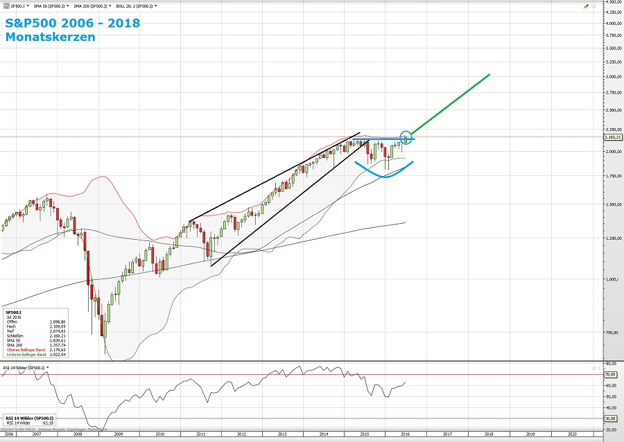 Und wenn wir wissen wollen, was der Markt gerade so macht, sollten wir auf das folgende, langfristige Chart des Leitindex S&P500 schauen. Denn was wir gerade erleben, könnte rein von der Marktstruktur her, durchaus auch das hier werden: