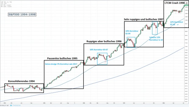 Bevor ich aber zu den Wahrscheinlichkeiten komme, will ich Ihren Horizont für die Möglichkeiten erweitern. Denn wissen Sie, welches Jahr dem Börsenjahr 2017 am Nächsten kommt? Es ist 1995, das letzte Jahr, das auch völlig ohne 5% Korrektur in den US Indizes abgelaufen ist. Und nun schauen wir mal, was um das Jahr 1995 herum passiert ist, klicken Sie auf das Chart und schauen Sie genau hin: