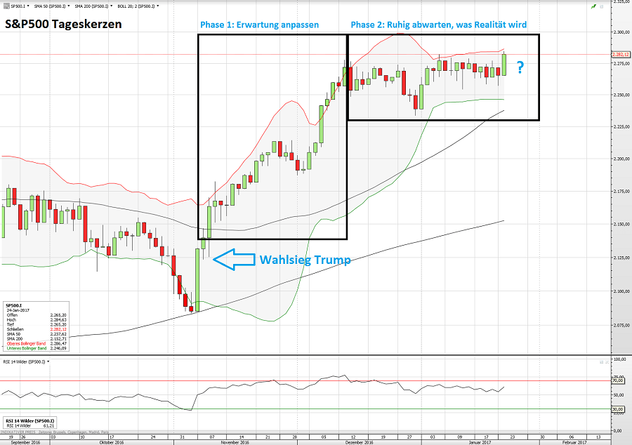 In der zweiten Phase, seit Ende letzten Jahres, ist der Markt in Wartestellung gegangen und wartet nun ab, was aus den ganzen Ankündigungen Trumps nun real wird und was nur Wahlkampfgetöse ist.