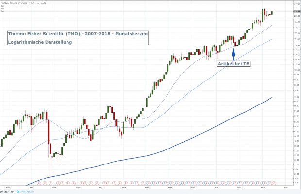habe am 11.10.2016 nach Lesen Ihres Beitrages 500 Aktien von TMO zu USD 156.00 gekauft. Leider, wie so oft, da sich der Kurs lange um diesen Ausgangswert eingependelt hatte , dann den Fehler begangen, die Aktie am 26.04.2017 wieder zu verkaufen (zu USD 162.00). Gewinnmitnahme (auch wenn es nur eine kleine ist) ist niemals falsch, aber man muss, gemaess dem Orakel von Omaha, auch bereit sein die Aktie fuer 10 Jahre zu halten. An diesem Vertrauen hat es mir zu meinem Nachteil gemangelt. Heutiger Kurs USD 209.
