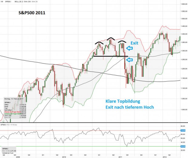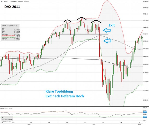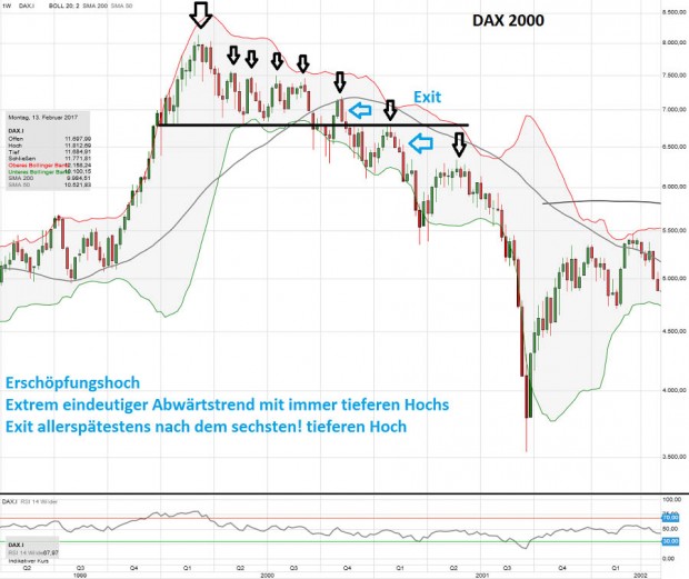 Im Folgenden zeige ich Ihnen nun die 8 Charts mit Markierung und kurzen Worten, die weitgehend für sich sprechen. Gegen Ende dann eine Zusammenfassung. Die blauen Pfeile beschreiben dabei die Stellen, an denen ein Anleger mit Verständnis für Markttechnik spätestens die Reißleine gezogen hätte, weil vorher schon genügend Warnsignale existierten. Vom Top hatte man damit schon 10-20% wieder abgegeben, das exakte Top trifft man nie, aber dem Großteil des Absturzes konnte man aus dem Wege gehen.