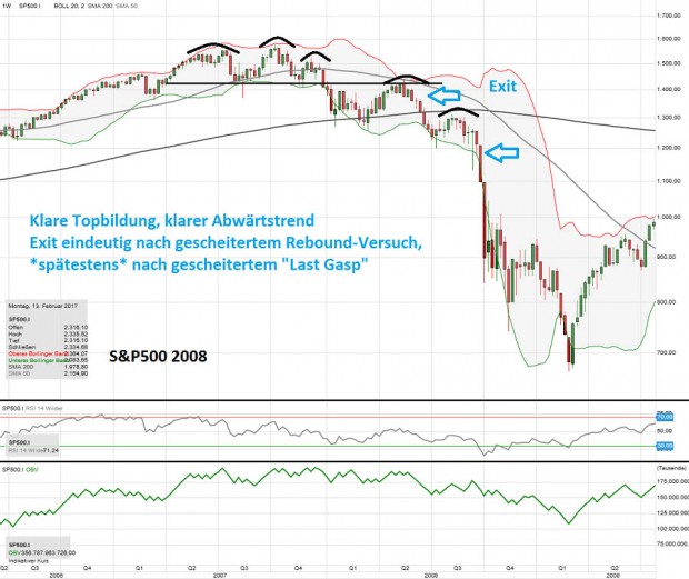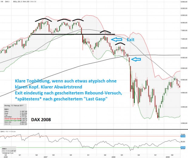 Wer also die Charts und die Marktmechanik klar beachtet hat, wer dann ausgestiegen ist, wenn sich klar ein Abwärtstrend oder eine vollendete Topformation ergab, war in 7 von 8 Fällen auf der sicheren Seite und hat den großen Absturz *nicht* voll mitmachen müssen. Vielmehr konnte dieser Marktteilnehmer dann viel tiefer wiederkaufen und so einen massiven relativen Ertrag erzielen. Der Crash legte sozusagen die Grundlage für riesige Gewinne danach. Einen Grund den Weg nach unten mitzumachen, gab es also nicht für die, die Augen hatten zu sehen und wenigstens die Grundkonzepte von Trends und Topbildungen verstanden hatten.