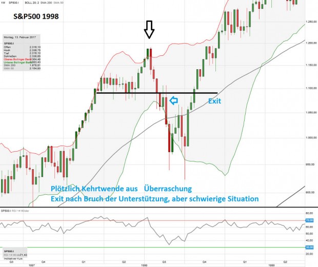 Der Black Monday von 1987 hatte keinen klaren Katalysator, man könnte sagen, der Markt ist unter dem eigenen Gewicht zusammengeklappt. Der LCTM Crash 1998 dagegen hatte für den Markt eine eindeutige, plötzliche und in ihrer Dynamik völlig überraschende Ursache. Insofern ist 1998 die Ausnahme und es wird interessant sein zu sehen, ob auch die Kurse da ein Ausnahmeverhalten zeigen.