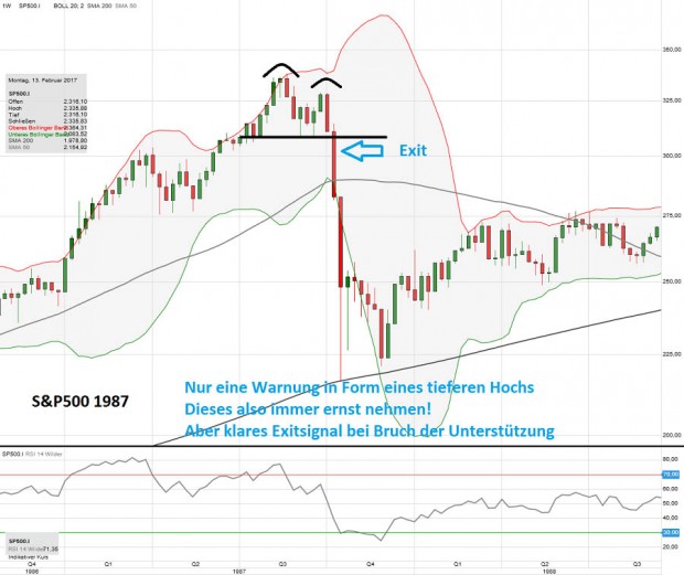 Wenn Börsen Höchststände generieren, schwillt typischerweise das mediale Crash-Gerede an. Die Realität ist aber, dass ein Markt der neue Hochs generiert, nicht einfach auf dem Fuße dreht, sondern in der Regel Zeit und Hin und Her braucht, um eine Topbildung zu abzuschließen. Auch 1987 beim „Schwarzen Montag“ war das nicht anders.