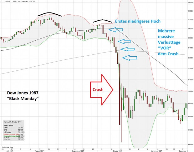 Und auch 1987 am „Schwarzen Montag“ war es nicht anders. Ich habe noch ein Chart für Sie, ich habe die Zeit vor dem „Black Monday“ mal auf Tageskerzen aufgelöst.
