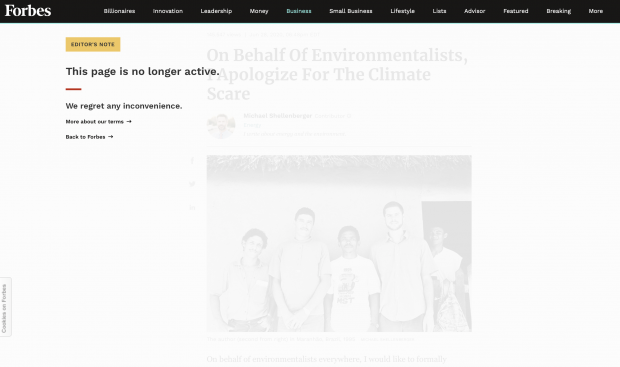 Sein lesenswerter Beitrag »On behalf of Environmentalists I apologize for the Climate Score« auf FORBES wurde binnen kurzer Zeit tausendfach auf Social Media verbreitet. Dieser Beitrag findet sich nun bei Quillette und hier, nachdem FORBES den Artikel nach zwei Tagen wieder offline genommen hatte. Shellenberger selbst bezeichnet diesen Schritt als »Censored«.