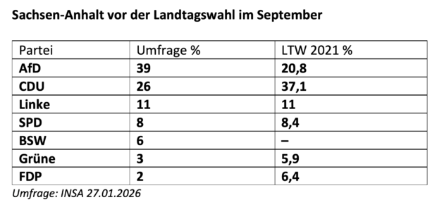 Auf diese Weise soll ein sogenanntes „Gesetz zur Parlamentsreform 2026“ den politischen Einfluss der größten Oppositionspartei, ihrer Volksvertreter und rund 40 Prozent des Wählerwillens nach der Landtagswahl im September praktisch ausschalten. Der Entwurf dafür wird am 5. März in den Magdeburger Landtag eingebracht. Der Ältestenrat verständigt sich dann über das weitere Verfahren.