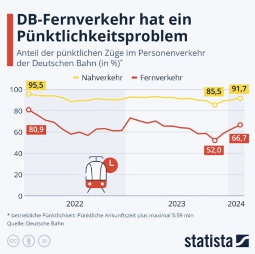 Zumal die Deutsche Bummelbahn seit Jahren so unglaublich unpünktlich fährt. Allein im Mai diesen Jahres weist die Pünktlichkeit des DB-Konzerns erneut katastrophale Zahlen aus: Blamable 63,1 Prozent der Züge des Fernverkehrs erreichten pünktlich ihr Ziel.