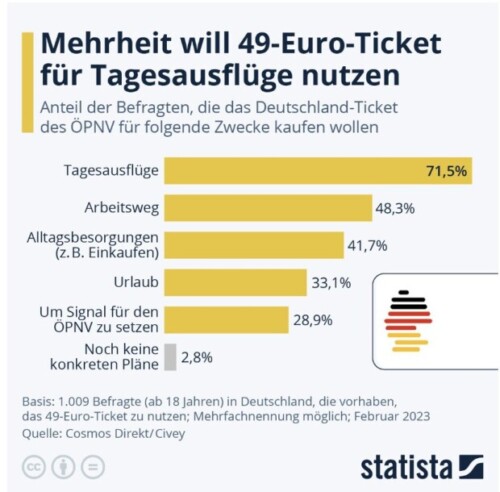Zu alledem hat die große Politik das 49 Euro Ticket eingeführt, ohne sich überhaupt Gedanken zu machen, ob die öffentlichen Verkehrsmittel überhaupt in der Lage sind, die zusätzlichen Belastungen zu bewältigen. Im Grunde dient das Billigticket jedoch nur dazu Tagesausflüge in den Freizeitpark Deutschland zu fördern. Für Berufsverkehr oder Wirtschaftsförderung ist es nur zweitrangig – siehe Grafik.