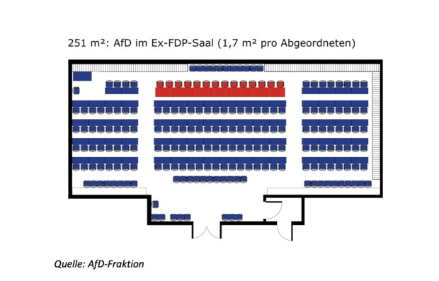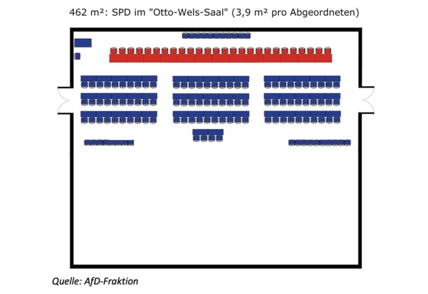 Einem SPD-Abgeordneten stehen umgerechnet auf den jeweiligen Saal 3,9 Quadratmeter zu, aber einem AfD-Parlamentarier nur 1,7 Quadratmeter.