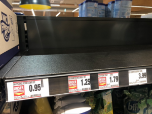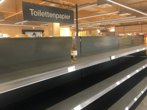 Man geht heute ins Kaufland, zu Rewe oder Edeka nicht mehr mit dem Ziel etwas ganz Bestimmtes zu kaufen, sondern schaut wie einst im Osten, was da ist: Reis, Nudeln, H-Milch, Dosen-Suppen, Klopapier oder Küchen-Rollen. Der Kunde kauft, was er kriegen kann.