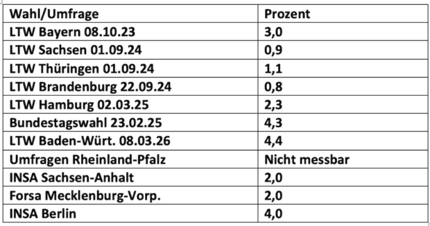 Schon nach dieser Wahl ist die FDP inzwischen in neun Landtagen sowie auch im Bundestag nicht mehr vertreten. So ein Tief hat es bisher noch nicht gegeben. Aber es kommt noch schlimmer. Auch die noch folgenden Landtagswahlen in Rheinland-Pfalz (22.03.26), Sachsen-Anhalt (06.09.26), Mecklenburg-Vorpommern (20.09.26) und Berlin (20.09.26) gehen laut Umfragen mit sehr hoher Wahrscheinlichkeit verloren. Dann existiert die FDP bundesweit in 13 von 17 wichtigen Parlamenten nicht mehr als politische Kraft.