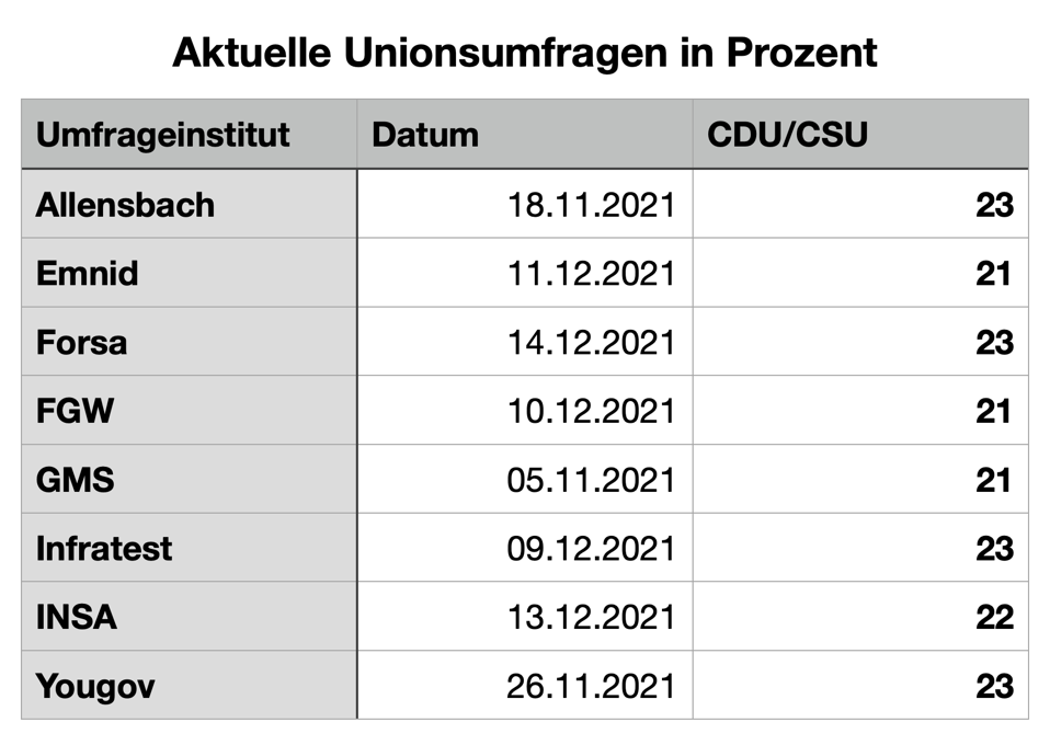 Die Merkelianer wollen offensichtlich im Sinne Majakowskis halt „den Schinder zu Schanden reiten“. Also den Rest der CDU weiter im tiefen Umfragekeller lassen und sie zur Bedeutungslosigkeit verurteilen. Im Schnitt liegt die frühere 40-x-Partei von Einheitskanzler Helmut Kohl bei den Demoskopen derzeit nur noch um die 22 Prozent – also sogar unter dem desaströsen Bundestagswahlergebnis für die Union (siehe Grafik).