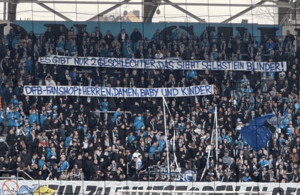 Beim Samstags-Heimspiel des Chemnitzer FC gegen Cottbus, ebenfalls in der Regionalliga Nordost, zeigten dann die Rivalen ein pfiffiges Transparent mit dem Aufdruck „Es gibt nur zwei Geschlechter, das sieht selbst ein Blinder! DFB-Fanshop: Herren, Damen, Baby und Kinder“. Damit wiesen die Fans auf den zweigeschlechtlich gestalteten Shop des Verbands hin und führten dem DFB seine unsinnige und woke Geisteshaltung vor.