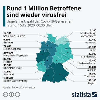 Was wir statt dessen wissen: Am 27. Januar 2020 wurde die erste Corona-Infektion in Deutschland bekannt. Seitdem hat das RKI mehr als 1,6 Millionen Infektionen registriert – das sind knapp zwei Prozent der Gesamtbevölkerung. Für über 1,2 Millionen davon gibt es dennoch Hoffnung wie die Grafik hier zum Schluss zeigt: