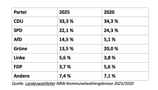 Angesichts der erstarkten AfD werden wir künftig in vielen Kommunen in NRW eine de facto-Zusammenarbeit der CDU mit der AfD erleben, schon deshalb, weil durch die Zersplitterung der Räte in viele Kleingruppen die Mehrheitsbildung enorm schwierig wird. Aber man wird das dann herunterspielen und behaupten, dass es keine Kooperation mit der AfD gibt. Auf Bundesebene hat sich die Union auf Gedeih und Verderb auf einen Pakt mit SPD, Grünen und Linkspartei eingelassen. Solange Merz Kanzler bleibt, wird sich daran nichts ändern. Auch wenn es Deutschland erkennbar schadet.