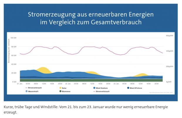 Beim Zukunftsthema erneuerbare Energien kam selbst der SWR nicht umhin, einmal die berechtigte Frage zu stellen: „Zu wenig Ökostrom im Winter?“ Doch nur keine Angst, liebe Stromverbraucher, der Südwestrundfunk hält natürlich sofort die beruhigende Antwort parat: Es seien ja bloß wenige Phasen, in denen Sonne und Wind nicht ausreichend Energie erzeugen.