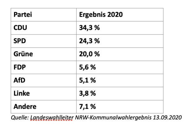 Schon bei der vergangenen NRW-Kommunalwahl am 13. September 2020 gab es im Vergleich zur vorhergehenden Wahl am 25. Mai 2014 heftige Verschiebungen für die Parteien in den Rathäusern, Kreistagen und Gemeinderäten. Wobei die Wahlbeteiligung leicht um zwei Prozent auf 51,9 stieg.
