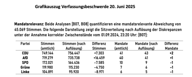Der Informatiker aus Dresden reichte daher am 20. Juni eine anwaltlich unterstützte Verfassungsklage ein. Sein Vorwurf: Die Wahl sei weder transparent noch rechnerisch konsistent.