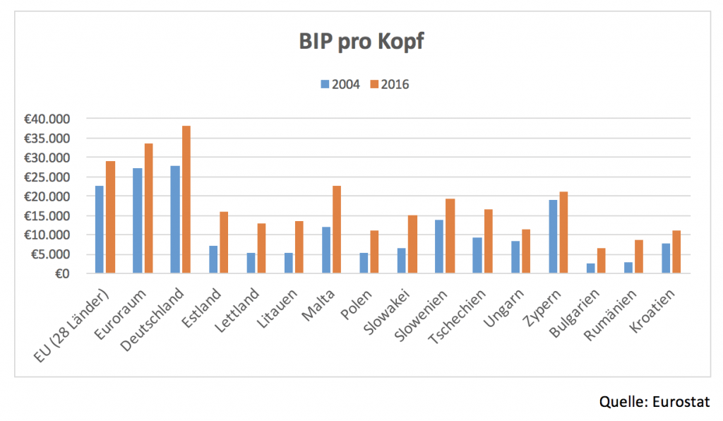 In unserem Nachbarland Tschechien herrscht heute Vollbeschäftigung! In Polen hat sich die Arbeitslosenquote von 19,1 (2004) auf 6,2 Prozent (2016) gedrittelt. In allen osteuropäischen Ländern gibt es sowohl bei der Wirtschaftsleistung pro Kopf als auch bei der Arbeitslosenquote eine positive Entwicklung. Diese wirtschaftliche Entwicklung ist nicht selbstverständlich und auch nicht überall gleich ausgeprägt, denn nicht überall wurde der Rechtsstaat konsequent eingeführt und Investoren eingeladen zu investieren. Wie brüchig das Vertrauen in den Rechtsstaat ist, sehen wir aktuell in Polen und Ungarn. Dabei ist für den wirtschaftlichen Fortschritt Vertrauen notwendig, nur dann wird dauerhaft investiert.