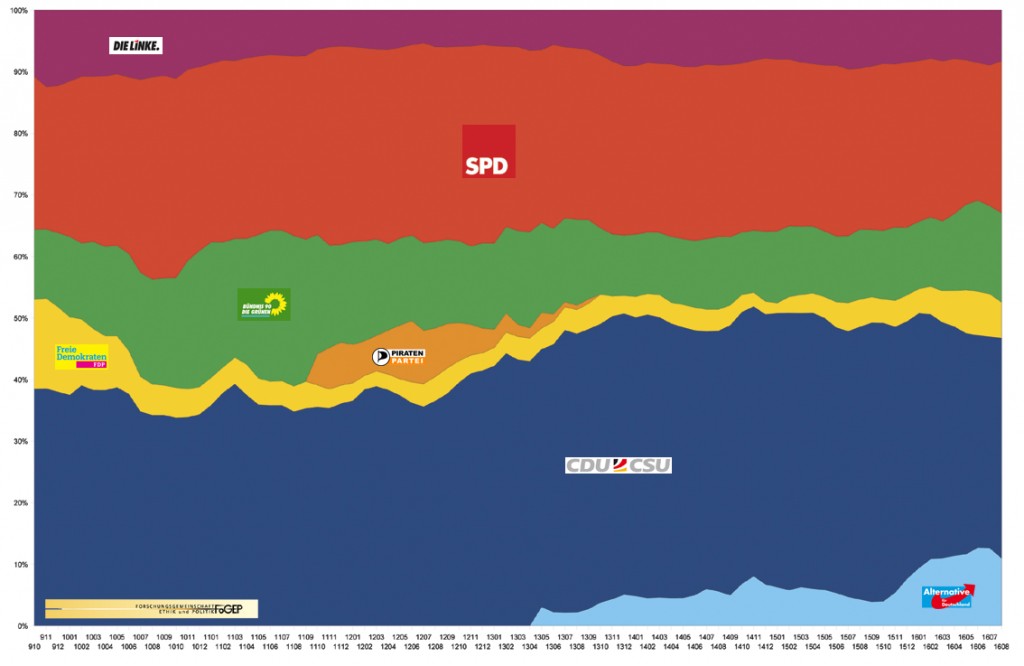 So sich insgesamt in der politischen Konstellation für August 2016 kaum relevante Änderungen zeigen, so könnte der Zugewinn der Regierungsparteien von insgesamt 2,8 Pp darauf hindeuten, dass das Vertrauen zum Kabinett Merkel behutsam zurückkehrt. Gerade in Zeiten öffentlich erkannter Krisen schart sich das Volk traditionell um die Herrschenden. Möglicherweise aber beginnen sich die Wahlwilligen auch nur an die Situation zu gewöhnen und sich von AfD und FDP dem scheinbar bewährten zuzuwenden – bei der AfD wegen schlechter, bei der FDP wegen Fehlens jeglicher Performance. Um eine derartige Bewertung jedoch definitiv vornehmen zu können, wird die Betrachtung der Entwicklung der kommenden Monate unverzichtbar sein.