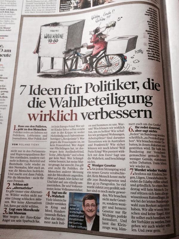 Eine ganze Woche lang wählen statt nur am Sonntag – mit diesem Vorschlag will SPD-Generalsekretärin Yasmin Fahimi die lahmende Wahlbeteiligung und den Wahl-Frust in Schwung bringen. Auch rollende Wahlkabinen soll es geben, und Urnen in Supermärkten. Aber sind die Wähler nur zu faul, um sich bis 18.00 Uhr in die Wahlkabine zu begeben? Oder liegt es vielleicht an der Politik, dass die Bürger sich abwenden? Hier 7 Tips für Politiker, wie die Wähler wieder an die Urnen zu kriegen sind – erstmals veröffentlicht im Jahresendheft der BamS, die auch ansonsten viele Tips und Ideen bringt.