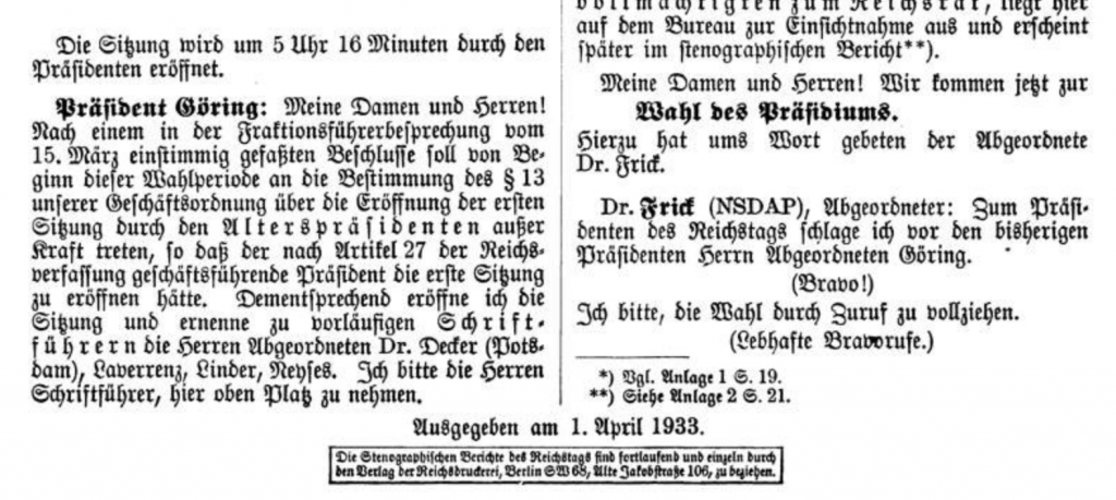 Die Büchsenspanner von Norbert Lammert, wenn schon nicht er selbst, hätten wissen müssen, dass die Parallele zur Suspendierung der Alterspräsidenten-Regelung am 21. März 1933 unter dem Vorsitz von Hermann Göring bei der Eröffnung des neu gewählten Reichstages gezogen werden würde. Der Vergleich stimmt mehrfach nicht, in durchaus erwähnenswerter Weise. Bei der Reichstagswahl 1933 handelte es sich nicht mehr um freie Wahlen. Göring brauchte – anders als heute im Bundestag – kein Votum des Reichstags zur Verfahrensänderung, diese hatte die „Fraktionsführerbesprechung vom 15. März“ einstimmig beschlossen. Das hier abgebildete gedruckte stenograpische Protokoll wurde am 1. April 1933 „ausgegeben“.