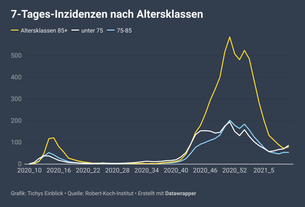 Diese abnehmende Fallsterblichkeit, resultiert auch daraus, dass Alte und sehr Alte mittlerweile weitaus seltener überhaupt infiziert wurden als in der letzten Welle über Weihnachten in Deutschland. Niedrige Todeszahlen sind damit programmiert.
