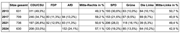 Damit scheint es inzwischen vorbei zu sein. Seit dem Jahr 2013 findet ein politischer Wechsel nach Mitte-Rechts nämlich nicht mehr statt. Regiert wurde das Land seitdem zweimal erneut von einer großen Koalition aus CDU/CSU und SPD und danach von einer kleinen Koalition aus SPD, Grünen und FDP. Diese ist 2024 erneut von einer schwarz-roten Koalition abgelöst worden, obwohl sich die rechnerischen Mehrheitsverhältnisse im Bundestag nicht erst 2024 stark nach Mitte-Rechts verschoben haben, wie die folgende, sich aus Erst- und Zweitstimmenergebnissen ergebende Sitzverteilung im Deutschen Bundestag zeigt.