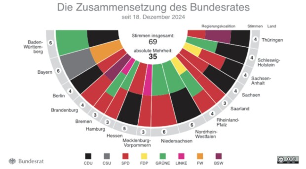 Thorsten Frei weiß: Der Bundesrat wird auf Linie sein. Die Konstellationen im Bundesrat mögen unübersichtlich sein. Dennoch ist die Lage hier überschaubar. Dort, wo Schwarz/Rot/Dunkelrot/Grün – in welcher Konstellation auch immer – die Landesregierungen stellen, hätten sie mit 47 Stimmen knapp eine Zwei-Drittel-Mehrheit: also knapp mehr als 46 von 69 Stimmen. Diese Mehrheit würde auch nicht kippen, wenn sich die Regierungen mit FDP-Beteiligung (Rheinland-Pfalz und Sachsen-Anhalt: 4 + 4 Stimmen), mit BSW-Beteiligung (Thüringen und Brandenburg: 4 + 4 Stimmen) und mit Beteiligung der Freien Wähler (Bayern: 6 Stimmen) enthalten müssten: Das wären dann 22 Stimmen.