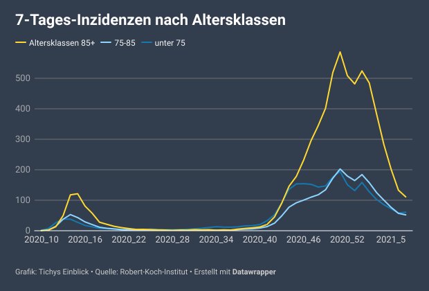 Die Corona-Folgen hingegen sind immer besser in den Griff zu bekommen. Die Altersheime werden zunehmend durch Schnelltests geschützt, über 80% der Bewohner sind das erste mal geimpft worden – auch wenn die Wirksamkeit unter Hochrisikopatienten noch nicht restlos geklärt ist, macht das Hoffnung. Die Krankenhäuser haben Erfahrung mit dem Virus gesammelt und die Fallsterblichkeit sinkt immer weiter. Noch schneller als die Infektionen in der Gesamtbevölkerung sind die bei den Hochrisikogruppen zurückgegangen. Da rund zwei Drittel der Corona-Toten über 80 sind, dürfte dieser Effekt alleine die Folgen der dritten Welle deutlich unter die einer harten Grippewelle drücken.