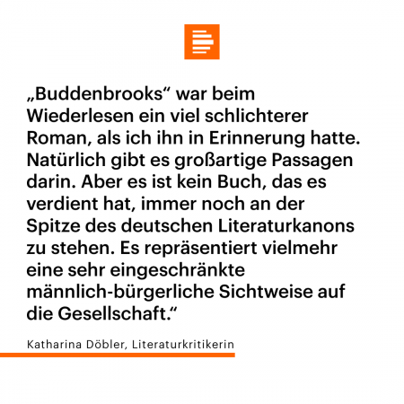 „’Buddenbrooks’ war beim Wiederlesen ein viel schlichterer Roman, als ich ihn in Erinnerung hatte. Natürlich gibt es großartige Passagen darin. Aber es ist kein Buch, das es verdient hat, immer noch an der Spitze des deutschen Literaturkanons zu stehen. Es repräsentiert vielmehr eine sehr eingeschränkte männlich-bürgerliche Sichtweise auf die Gesellschaft.“