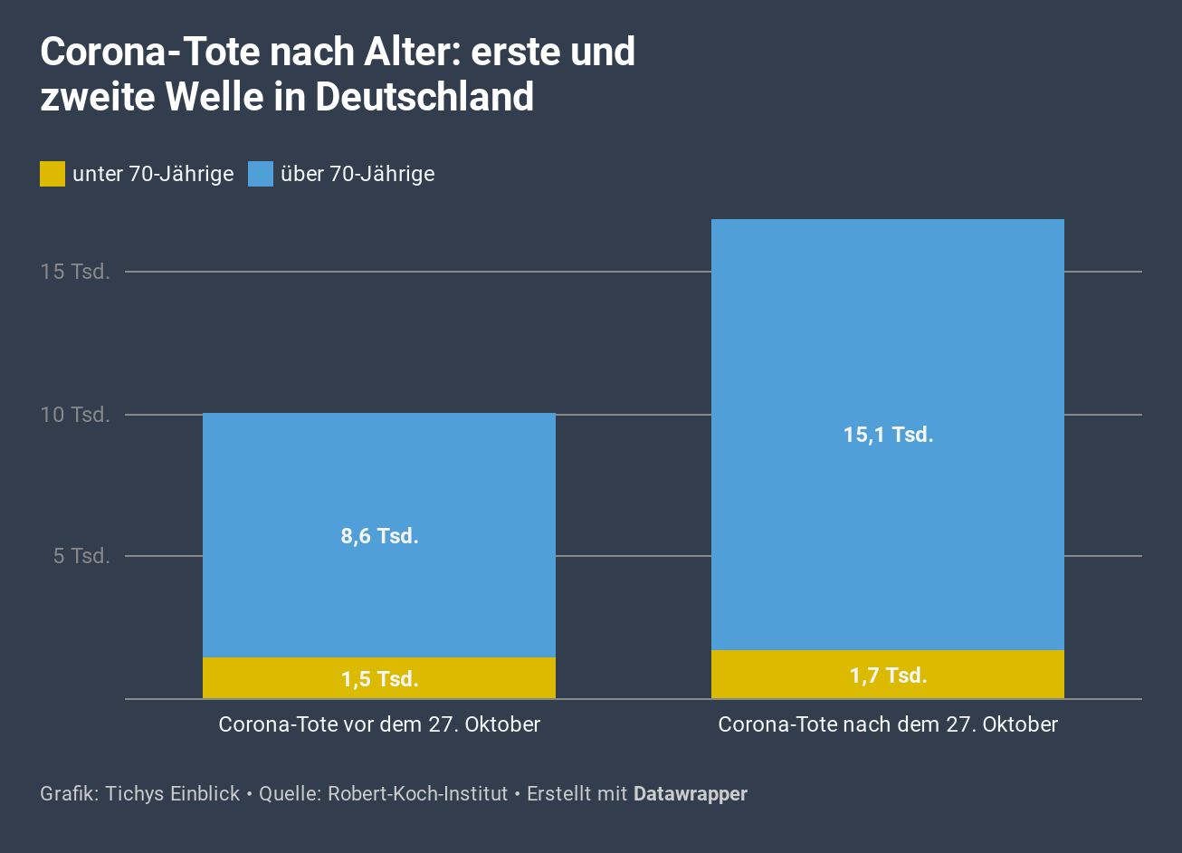 Dementsprechend nehmen die ohnehin schon sehr hohen Todeszahlen bei den Risikogruppen in der 2. Welle überproportional zu. Bis zum 27. Oktober (ungefähr der Start des Lockdown Lights) starben 1.478 Menschen unter 70 Jahren an Corona und seit dem 27. Oktober weitere 1.746 – die Zahl ist hier ungefähr gleich. Bei den über 70-Jährigen sind bis zum 27. Oktober hingegen 8.612 Menschen gestorben und seitdem 15.128 – die Zahl hat sich also fast verdoppelt. Die Problematik spitzt sich in der 2. Welle zunehmend auf die Risikopatienten und die Altersheime zu, während bei der restlichen Bevölkerung vermutlich weder die Toten noch die Infektionen wesentlich die erste Welle übersteigen.