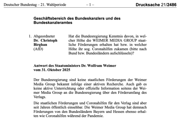 Noch schwerer wog die Tatsache, dass Weimer und Bundesregierung unzutreffende Angaben zu seinen Beteiligungsverhältnissen gemacht haben. Immer wieder danach gefragt, gingen an alle quasi die gleichen ausweichenden Antworten wie diese raus: „Es besteht keine Nebentätigkeit von Herrn Weimer bei der Weimer Media Group. Herr Dr. Weimer ist vor seinem Amtsantritt aus der Geschäftsführung ausgetreten, hat keine Stimmrechte und ist in keinem Beratergremium. Es wurde gemäß des Bundesministergesetzes gehandelt und transparent gemacht.“ Immer wieder wurde ganz bewusst – und auffallend wie ein Suchscheinwerfer – seine 50-Prozent-Beteiligung an der Weimer Media Group ausgespart.